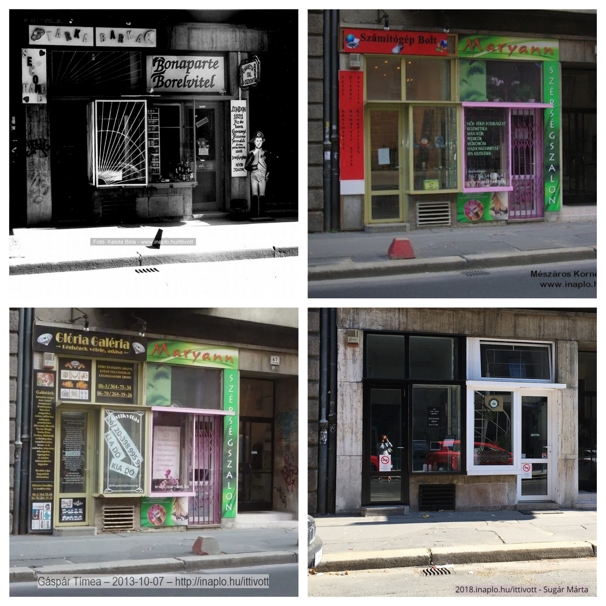 Érdemes végigkísérni a balra lévő kis üzlet évtizedeken át tartó átváltozásait is: Kalota idejében 'Tarka-barka' second hand shop működött itt, majd később a 2010-es fotón is látható számítógépbolt lett belőle.