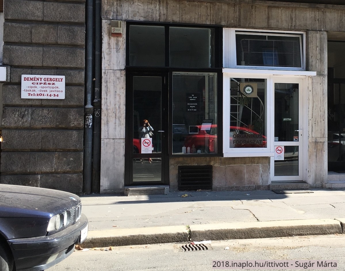 Jó 20 év múlva, 2018-ban pedig így néz ki a hely: A színes cégtáblák eltűntek, a két egymás melletti kis bolt egyszerűen fehérre és feketére van festve.